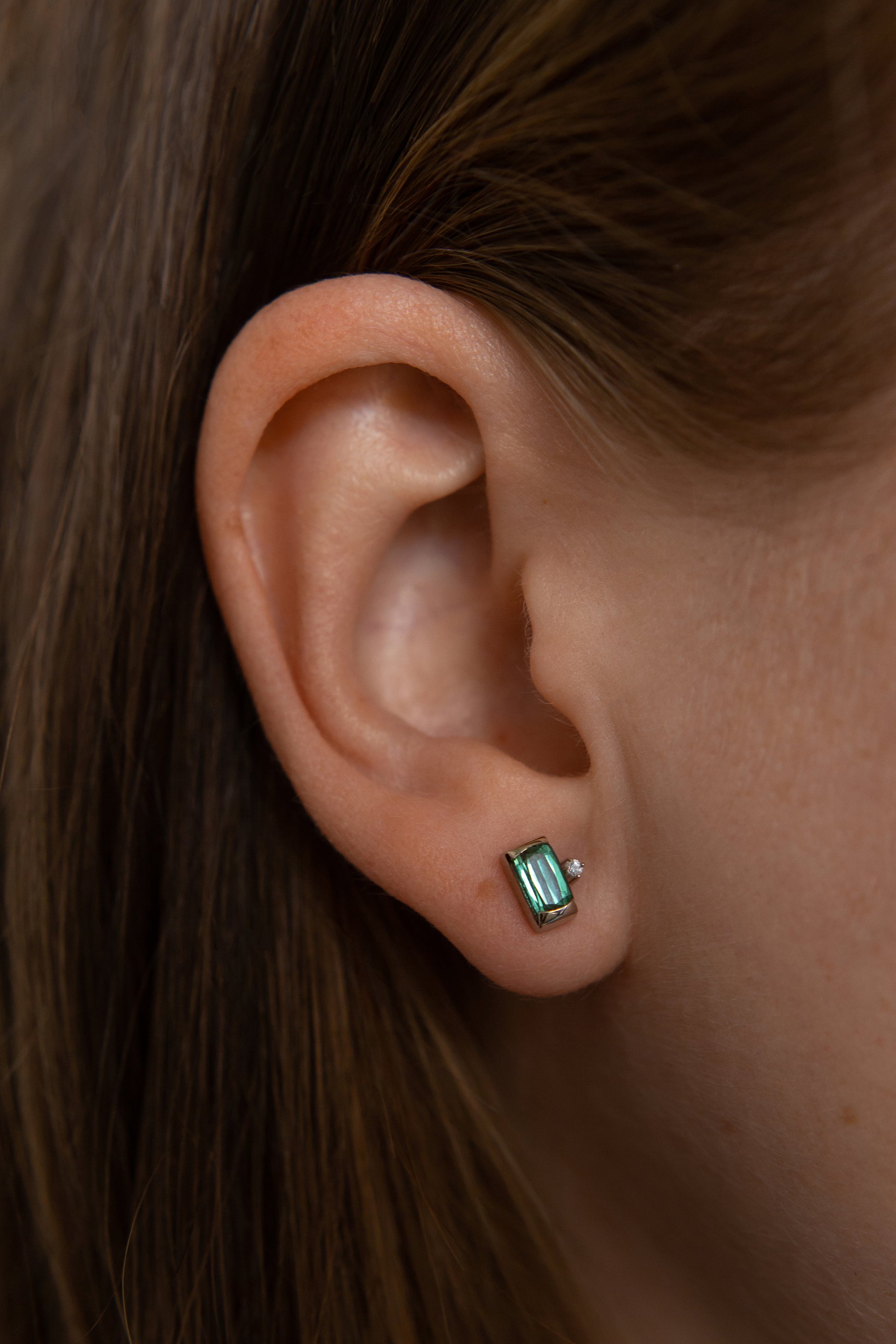 Витончена комбінація великих прямокутних турмалінів кольору морської хвилі з маленькими круглими діамантами. Мінімалістичний дизайн з вашими улюбленими надійними закрутками.