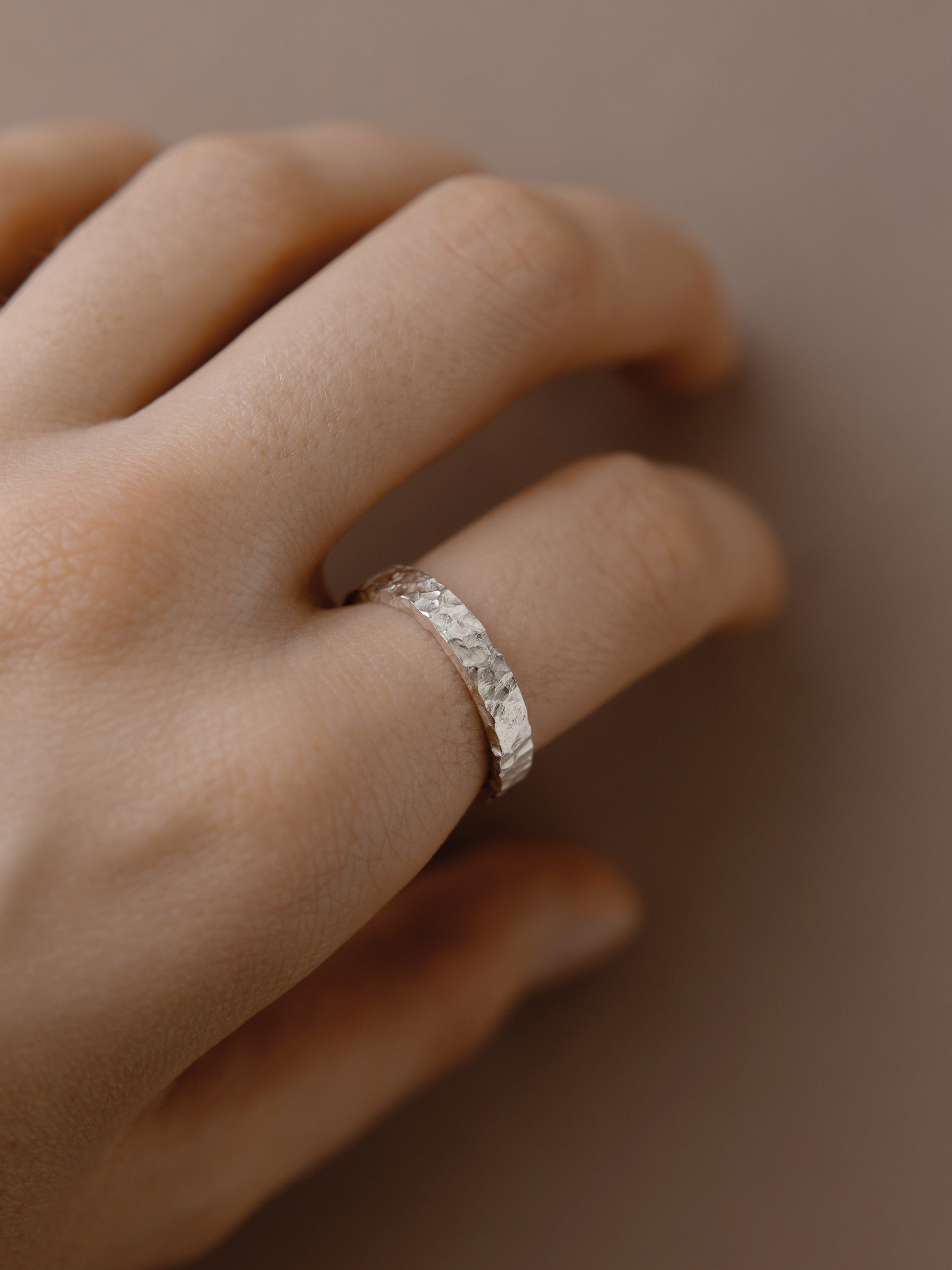 Текстура цієї каблучки народжується з дотику. Кожен удар ювелірного молоточка залишає на ній неповторний відбиток.