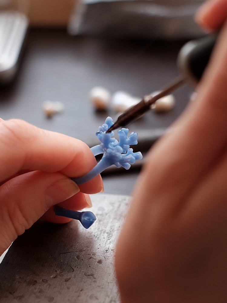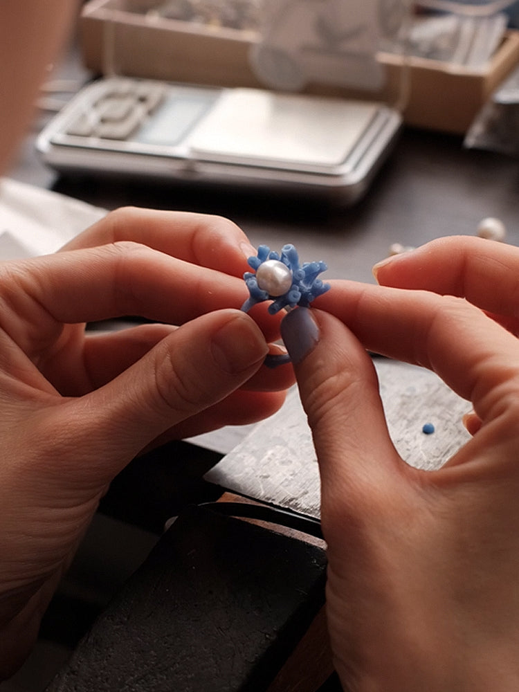 "Кожна з цих кольорових перлин дбайливо посаджена в напівсферичну чашу, щоб бути захищеною від зайвих дотиків і одночасно бути максимально, наскільки можливо, відкритою світу. Мені здається, знаходження цього балансу захищеності та відкритості — це базовий вияв турботи про себе," – каже авторка прикрас Крістіна, психотерапевт за основною професією.