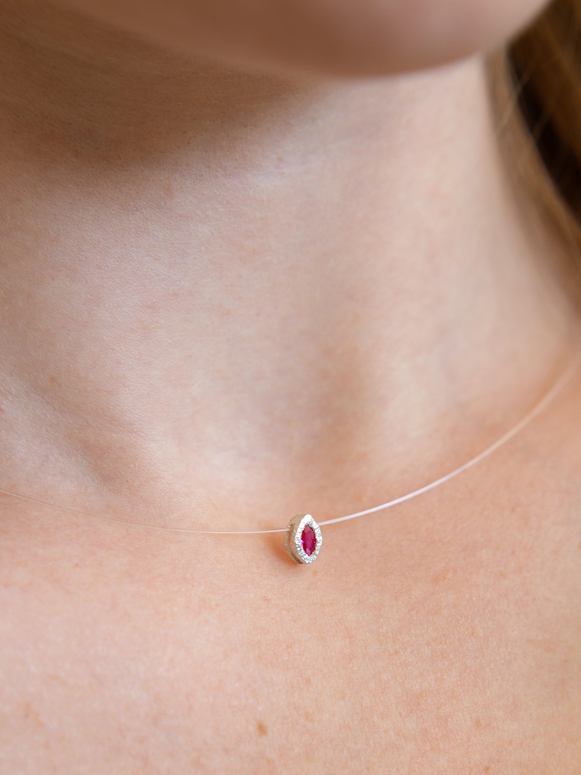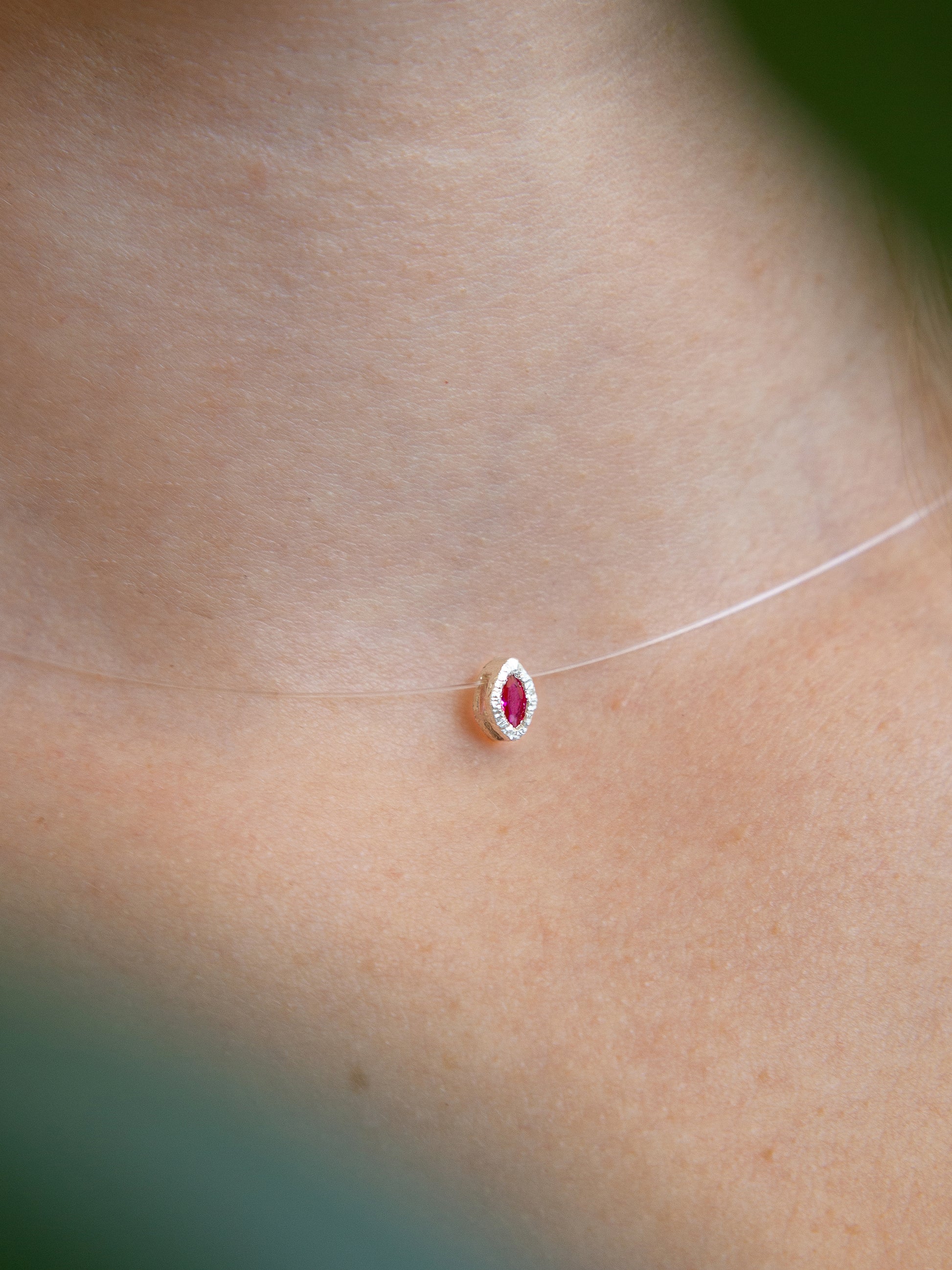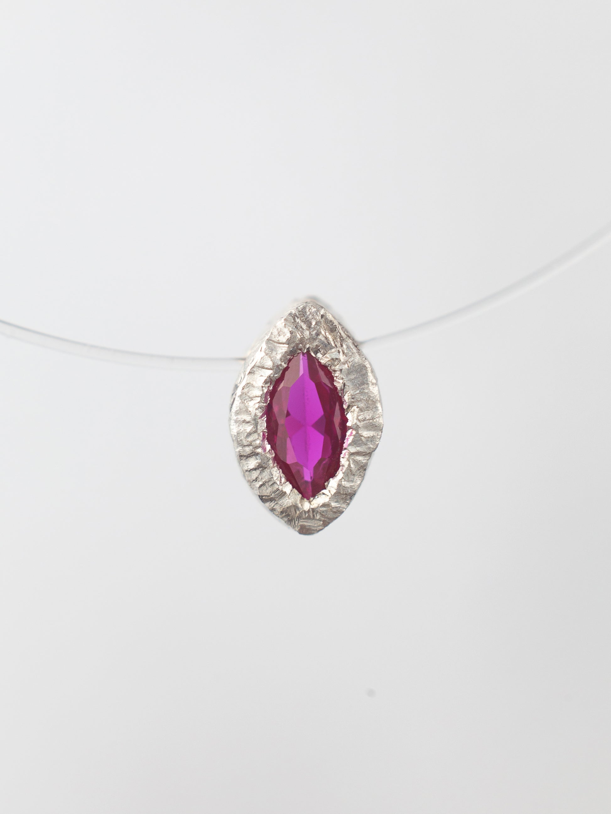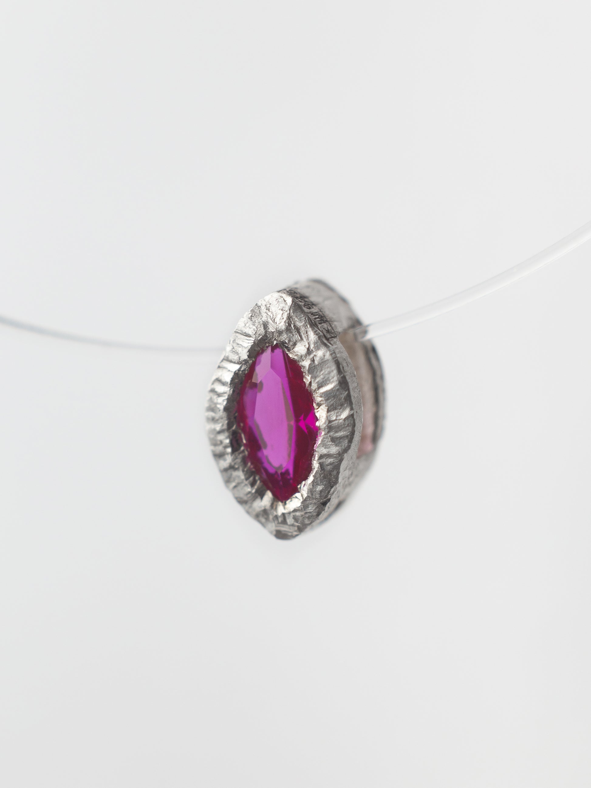 A scarlet ruby in the embrace of seemingly raw metal. A pendant that embodies feminine nature.